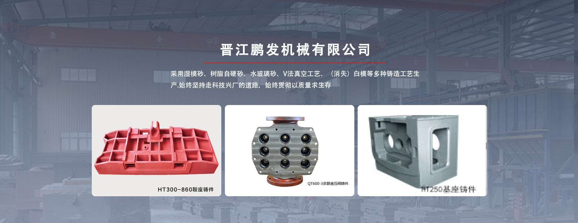 鵬發機械鑄造生產鞋機、大圓針織機、液壓機、數控機床、CNC加工中心配件。鵬發機械鑄造采用濕模砂、樹脂自硬砂、水玻璃砂、V法真空工藝、(消失)白模等多種鑄造工藝生產。鑄件材質有:多種牌號灰口鑄鐵、多種牌號球墨鑄鐵、鑄鋼件,同時也生產低合金鋼、高錳鋼等材質鑄件。員工120人,其中技術人員12人。具有雄厚的技術力量、先進的檢測儀器及完善的管理體系。現有設備:2T中頻感應電爐3套6爐,雙臂樹脂自硬混砂機3套,S114混砂機3套,V法真空鑄造生產線造型工作臺6站,拋丸、水力清理鑄件5套,退火設備1條,爐前鐵液質量管理儀,高頻紅外碳硫分析儀,微機高速分析儀,熔煉測溫儀,布氏、洛氏硬度計,金相、拉力試驗機,光譜儀等生產、檢測設備齊全。